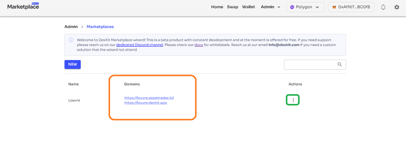 This is the [administrative area](https://whitelabel-nft.dexkit.com/admin). Here you can check your DApps in a simple way after connecting your wallet. As you can see, within the orange outline are **the DApps that we created before.**