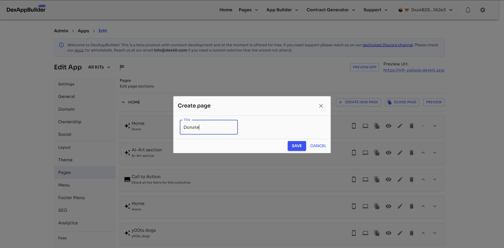 <figure><img src="https://1167648080-files.gitbook.io/~/files/v0/b/gitbook-x-prod.appspot.com/o/spaces%2FWrjgYUyO4ch1fBehrMEq%2Fuploads%2FNwwvI1aegrX3Hv81kCpN%2FDexAppBuilder%20_%20App%20Builder%20Setup%20-%20Brave%2003_06_2023%2011_19_08.png?alt=media&#x26;token=cc255c48-ad8d-45d8-9bb3-2cc221502920" alt=""><figcaption><p>Hit on «Save» when you're done with your page name.</p></figcaption></figure>