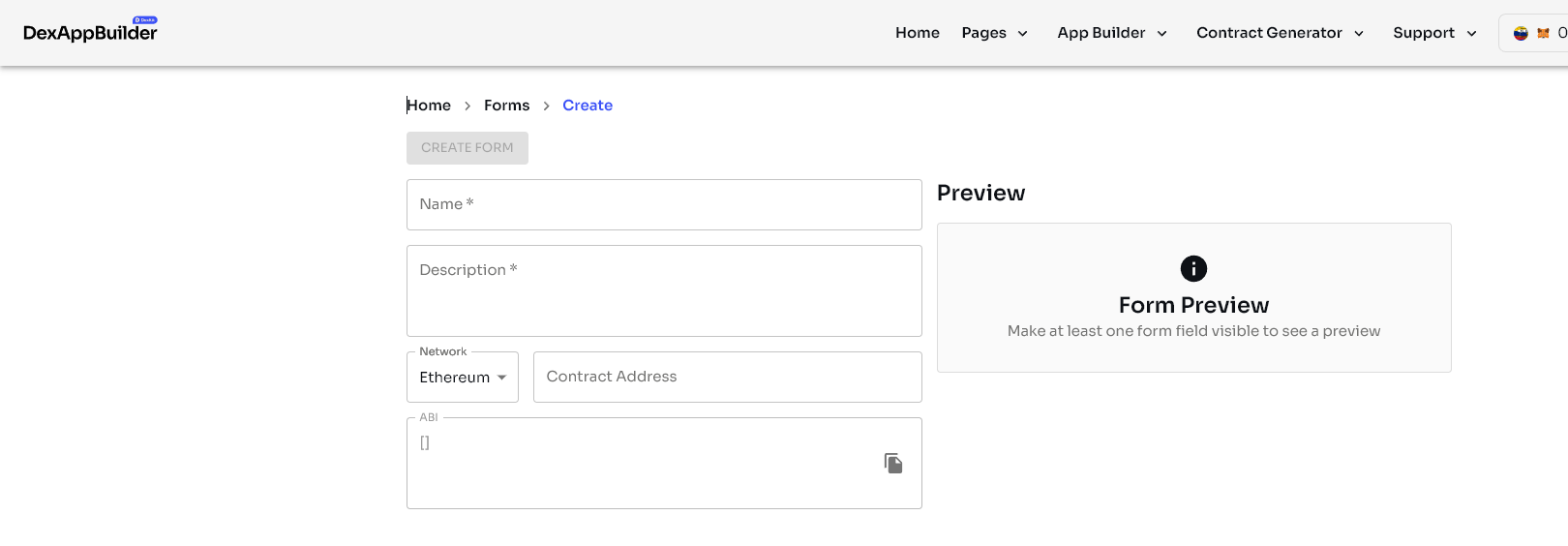 To start using this tool you must [create your DApp](https://docs.dexkit.com/defi-products/dexappbuilder/creating-my-first-dapp) with DexAppBuilder. In this way you can add the forms that you create here (those that contain the calls to the contracts that we will need for our app).