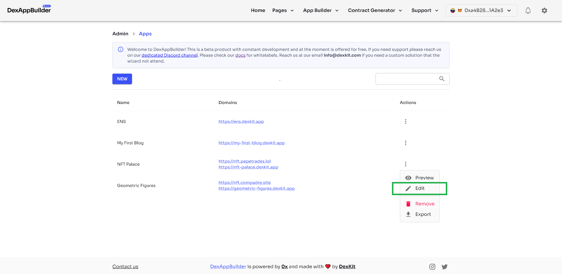 1. Assuming you have already created your DApp with DexAppBuilder, navigate to the admin dashboard. Now click in the three-dot menu at the right of your DApp and click on «edit».