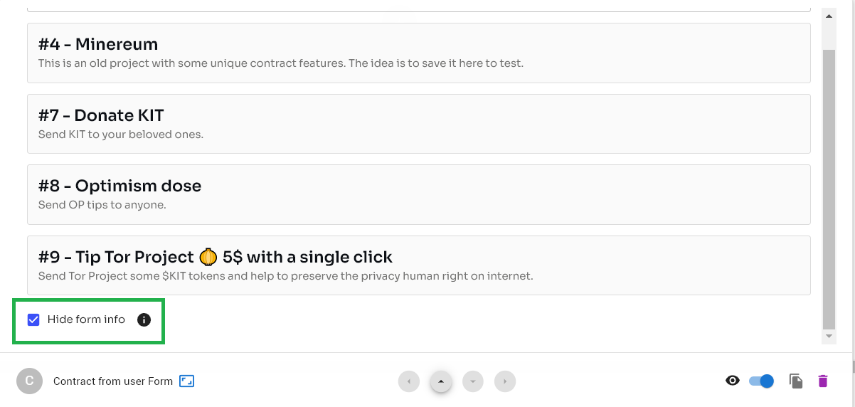 Once we have displayed the contract addresses of our favorite tokens (in this case the one we will use for the donation button) we proceed to scan the address to obtain the functions. Below we explain how to do it and create a widget for each of the contract calls or “forms”, as we decided to call it laconically.