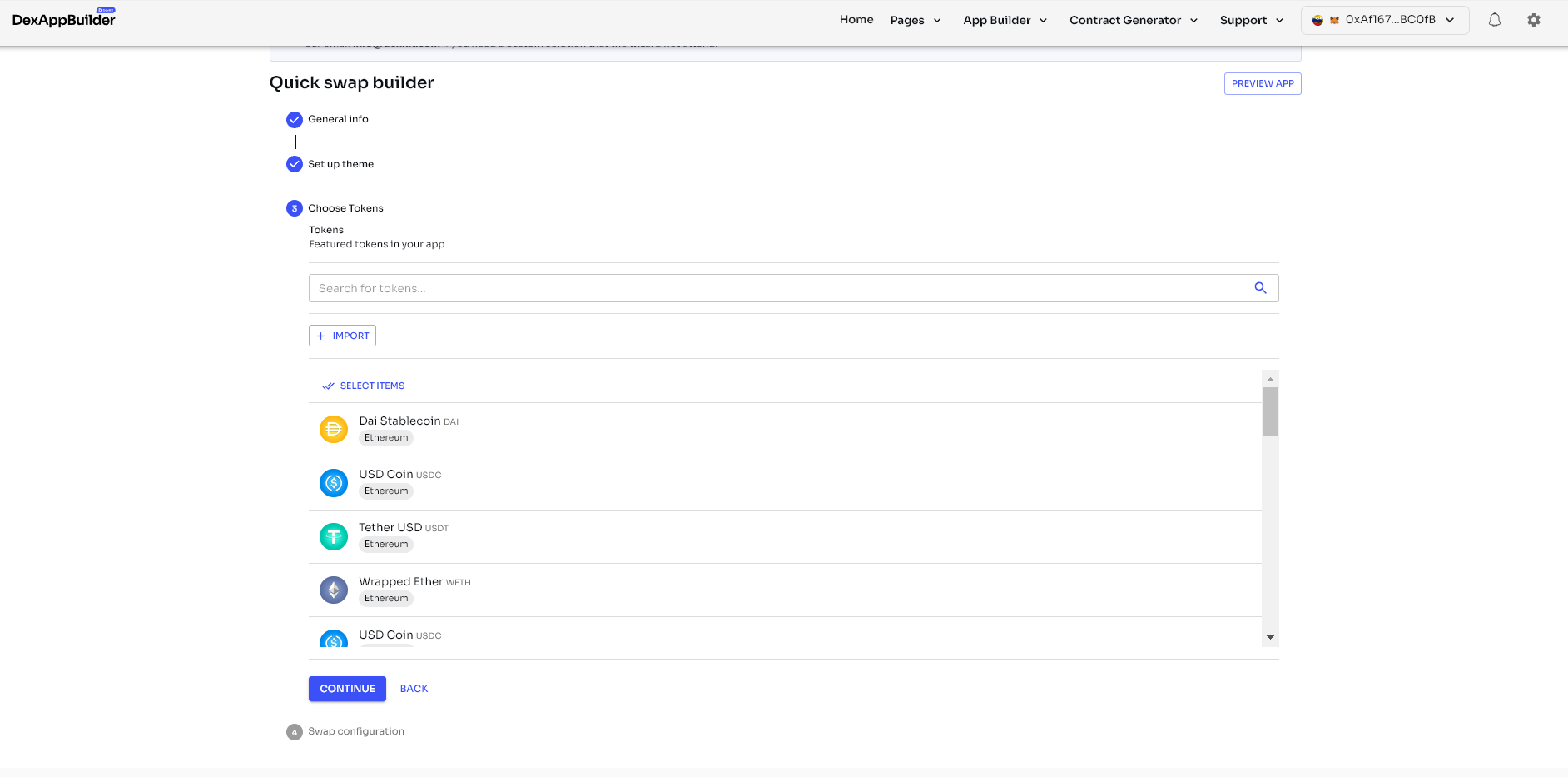 1. Navigate to the [Quick Swap builder](https://dexappbuilder.dexkit.com/admin/quick-builder/swap) and fill all the blanks with the requested information about your swap. The name (it will the same for your domain name, so be careful here unless you are willing to use custom domains). Click on the blue «CONTINUE» button when you finish.