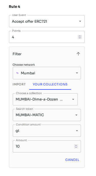 * **Aceitar oferta ERC1155:** Semelhante à regra anterior, exceto que recompensa usuários pela compra de tokens ERC1155.&#x20;