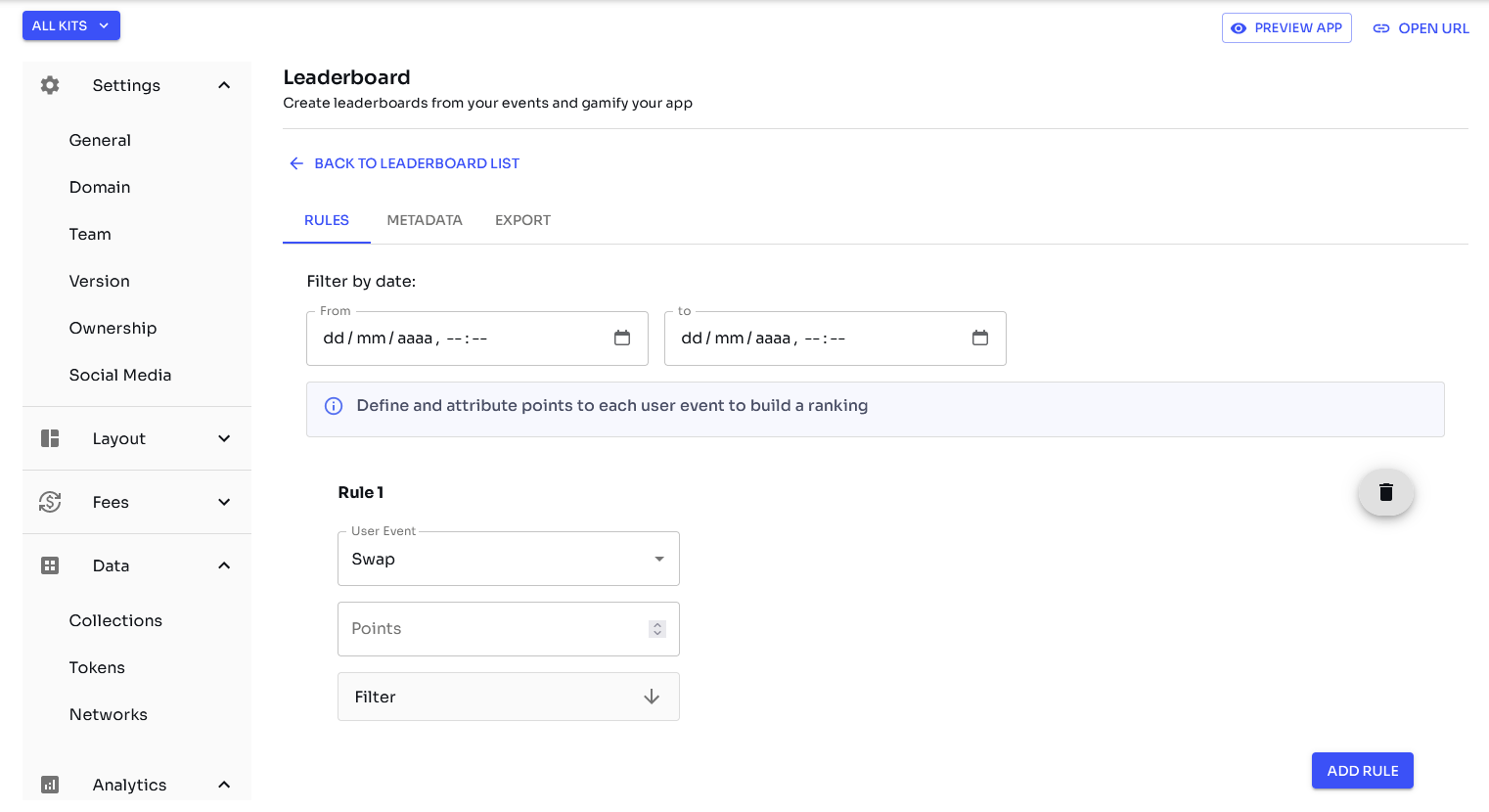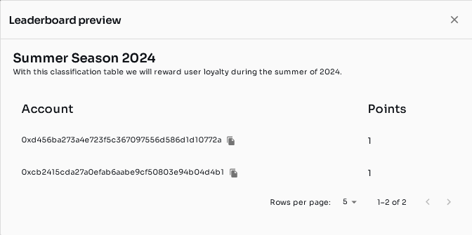 Leaderboards permite ao criador de um DApp implantado com o DexAppBuilder adicionar vários sistemas de pontuação para recompensar os usuários do seu DApp sempre que executarem quaisquer das ações predefinidas no sistema.
