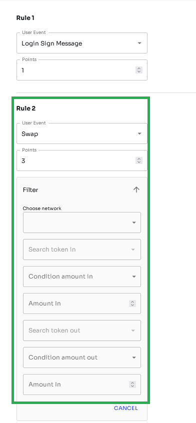 Esta condição particular nos permite personalizar amplamente o que, como e quem recompensar com a pontuação específica. Podemos escolher a **rede**, o **token** e a quantidade necessária para satisfazer esta condição. **Condições para quantias** são **gt** (maior que), **gte** (maior ou igual), **lt** (menor que), **lte** (menor ou igual) e **eq** (igual).
