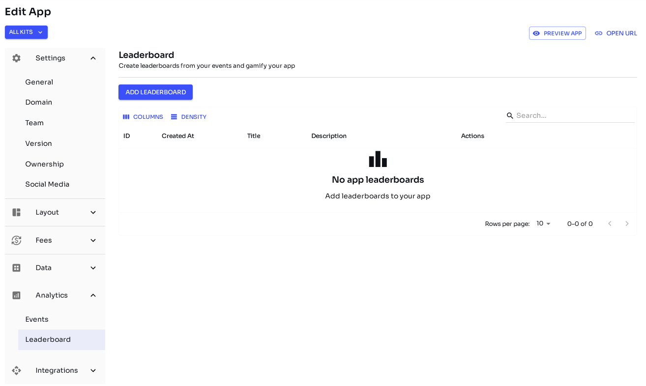 * ![](https://1903426557-files.gitbook.io/~/files/v0/b/gitbook-x-prod.appspot.com/o/spaces%2FWrjgYUyO4ch1fBehrMEq%2Fuploads%2Fqf52ZPpUpn2IA3xhf0Y3%2Fimagen.png?alt=media\&token=b2741864-eea4-4192-97ee-14923d021a22) **Excluir leaderboard do app:** Excluir esta tabela e todos os seus dados. Cuidado! Esta ação é irreversível! Nem mesmo o DexKit poderá recuperar estes dados.