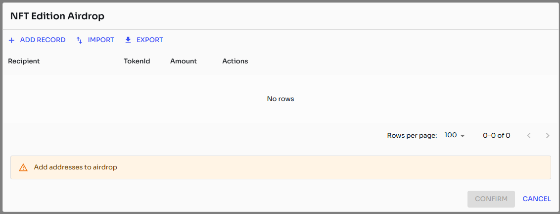 Uma vez implantado via DexContracts, o **AirdropERC1155** contrato fornece um painel para gerenciar a distribuição de NFTs ERC1155 (também conhecidos como editions) para múltiplos destinatários. Este contrato é ideal para distribuir ativos NFT fungíveis ou semifulngíveis em um processo em lote.
