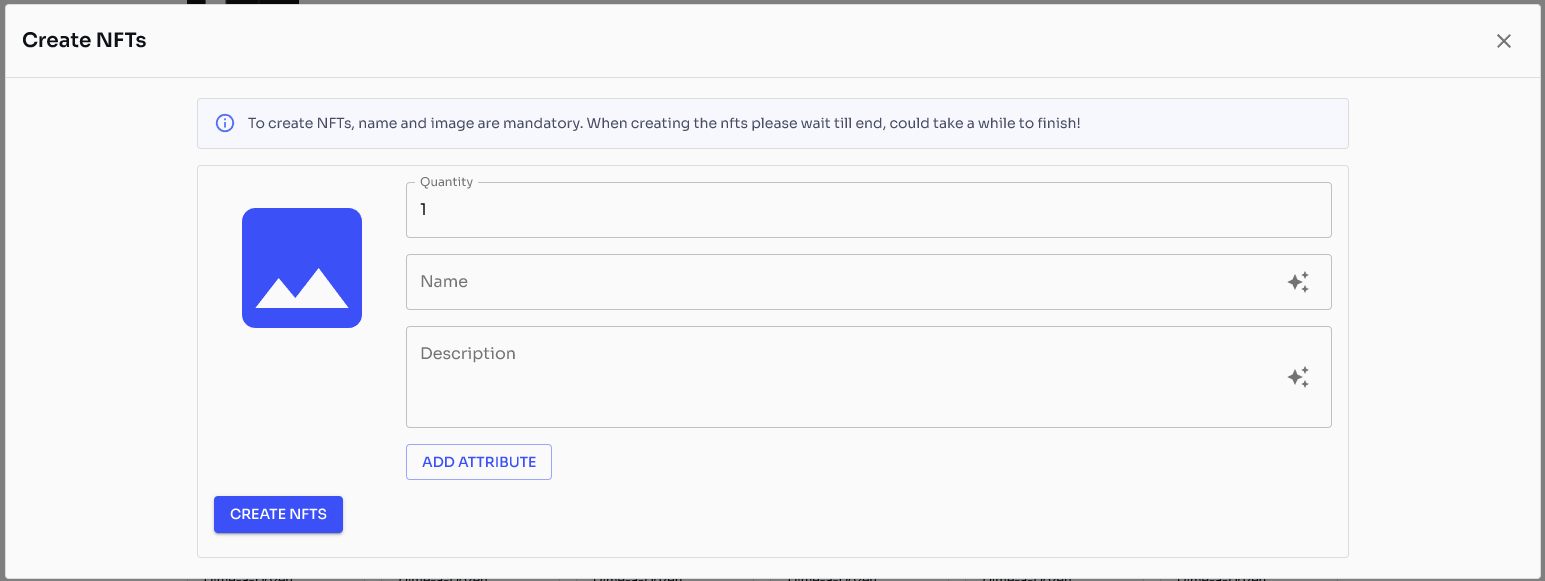 * Escolha a imagem para seu NFT clicando no componente azul de envio de imagem.