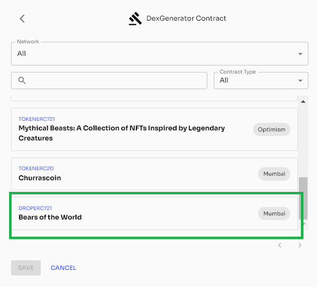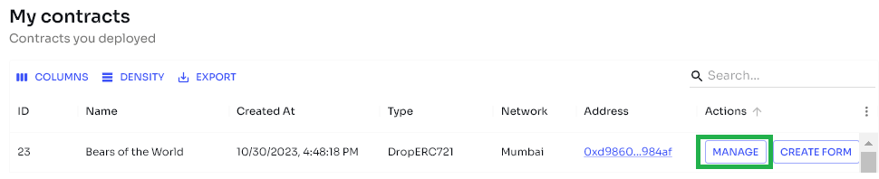 Uma vez que tenhamos implantado o contrato, prosseguiremos para a [seção de gerenciamento de contrato](https://dexappbuilder.dexkit.com/forms/contracts/list), localizaremos o contrato que acabamos de implantar e clicaremos no botão "Gerenciar" que nos levará ao painel de configuração.