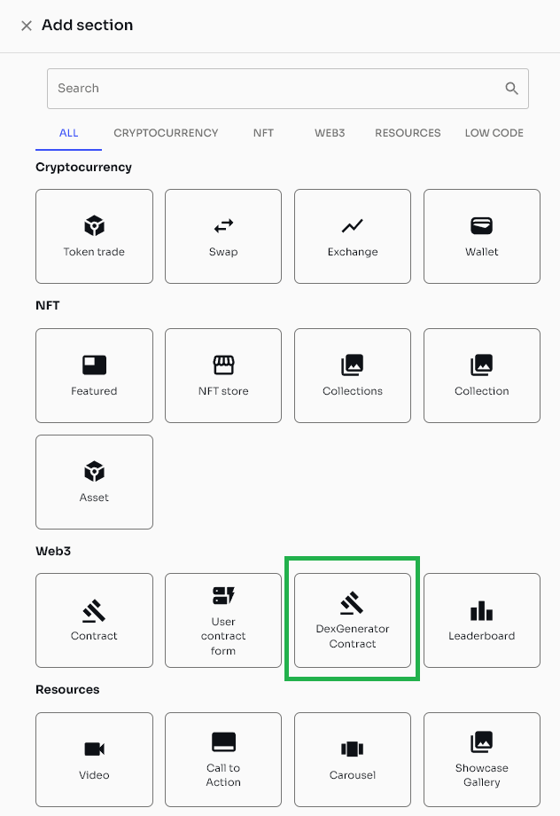 4. Depois de pressionar o botão «+ Add section» um modal com vários componentes para escolher será aberto. Por favor, procure o componente «DexGenerator Contract» 👇