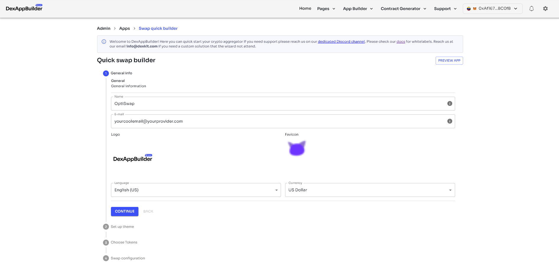 1. Navegue até o [Construtor Quick Swap](https://dexappbuilder.dexkit.com/admin/quick-builder/swap) e preencha todos os campos com as informações solicitadas sobre seu swap. O nome (será o mesmo do seu nome de domínio, então tenha cuidado aqui a menos que queira usar domínios personalizados). Clique no botão azul «CONTINUAR» quando terminar.