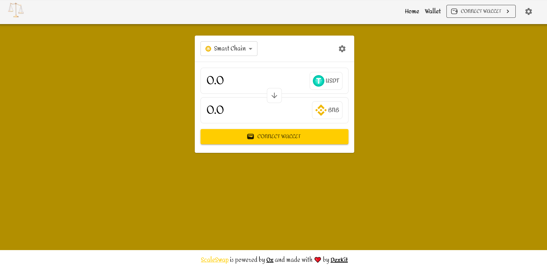 <figure><img src="https://1903426557-files.gitbook.io/~/files/v0/b/gitbook-x-prod.appspot.com/o/spaces%2FWrjgYUyO4ch1fBehrMEq%2Fuploads%2FtRaFyXmLAaG1GM9PJEYR%2Fbrave_screenshot_scaleswap.dexkit.app.png?alt=media&#x26;token=477af9fd-2f9d-4a93-8dd3-7082d4615f1f" alt=""><figcaption><p>Outro produto de swap implantado pela comunidade. Veja como as cores da marca e a rede nativa mudaram nesta versão.</p></figcaption></figure>